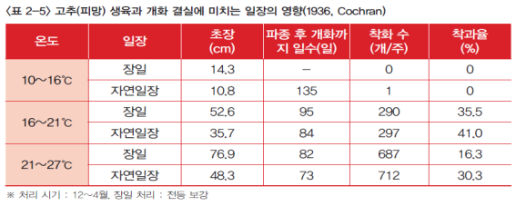 고추 의 생육에는 장일(햇빛 받는 시간이 길어지는 것) 조건에서 파종 후 개화까지의 소요 일수는 짧아지고 착과 수가 다소 많아지는 경향이 있지만, 일장(하루 중 햇빛을 받는 시간)이 크게 관여하지 않는 것으로 알려져 있다<표 2-5>.