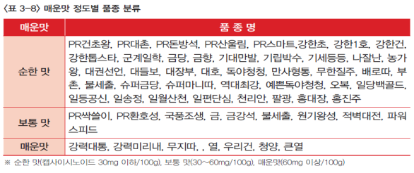 고추 품종의 매운맛 정도는 건고추의 주요한 품질 특성으로, 매운맛을 나타내는 성분의 함량에 따라 구분되며 국내 건고추의 대부분은 순한 맛으로 매운맛 품종의 비중이 높지 않다<표 3-8>. 건고추의 매운맛 정도별 품종 분류는 재배 환경에 따른 매운맛의 변화와 매운맛의 구분 기준에 따라 차이가 있을 수 있다.