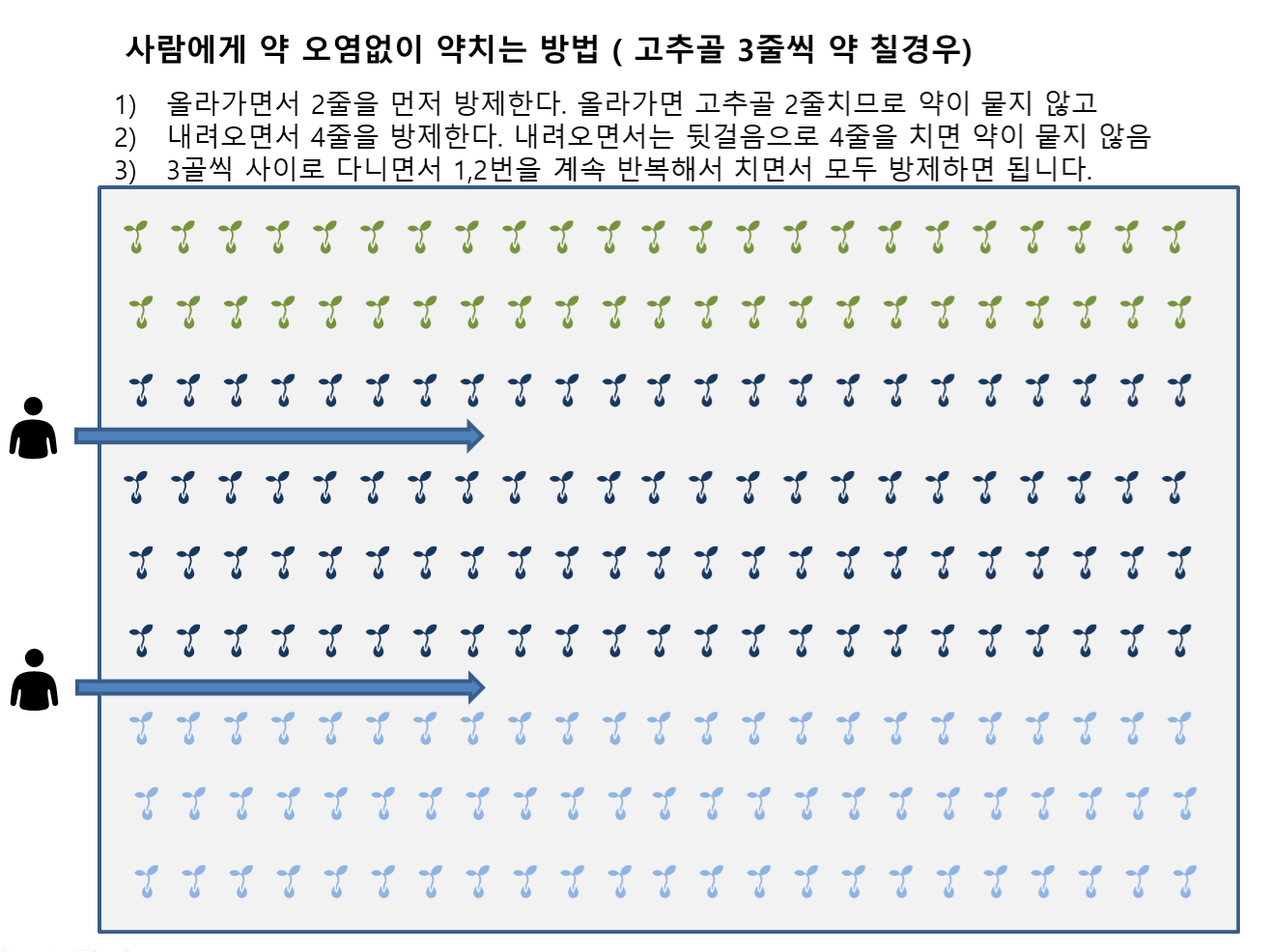 고추밭에서 가장 효과적이고 안전한 살포 방법은 3줄씩 방제방법 → 2줄 올라가며 살포 → 4줄 내려가며 살포하는 패턴입니다. 이 방법의 장점은 다음과 같습니다.