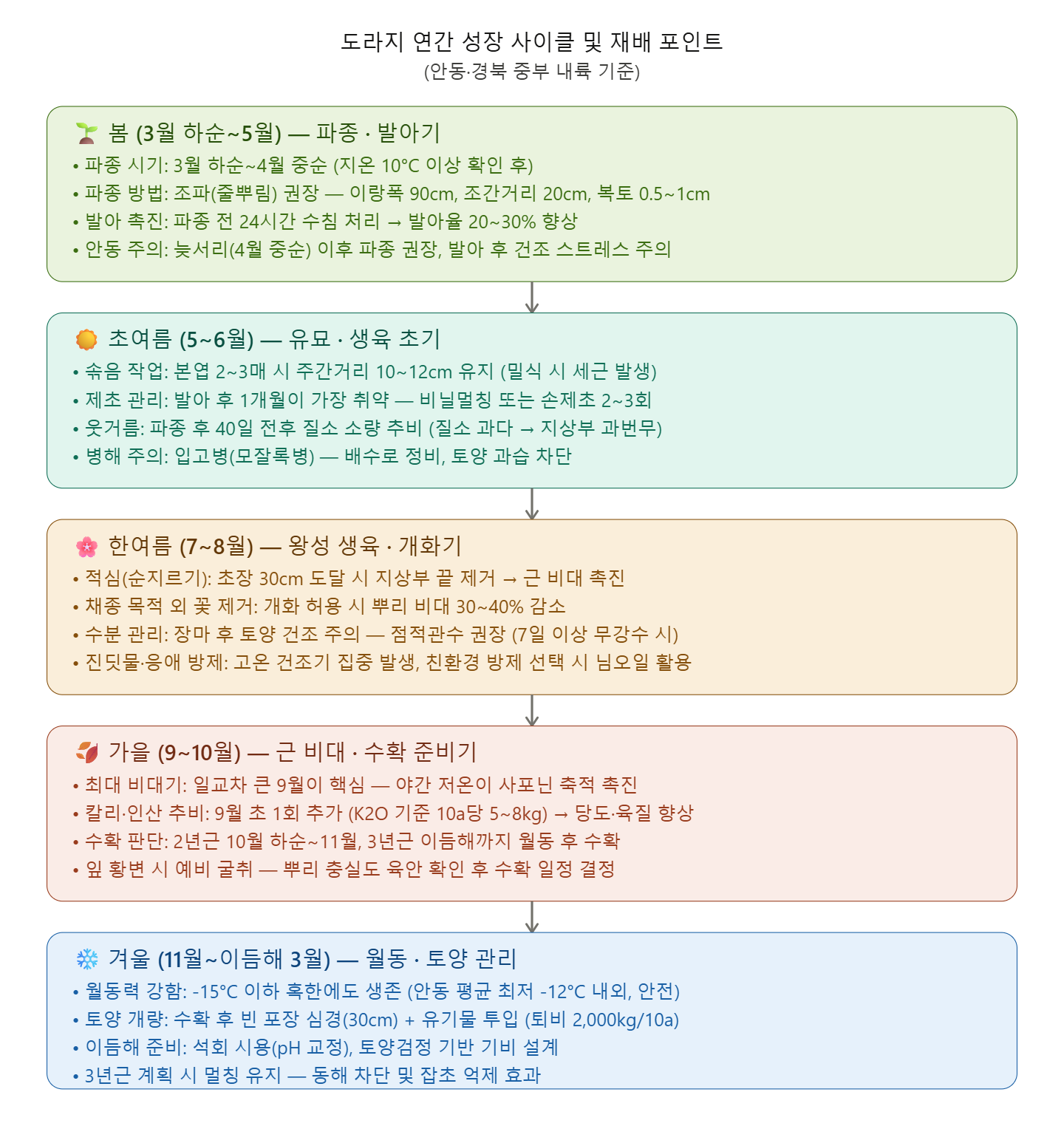아래 다이어그램은 도라지의 계절별 생육 사이클과 각 시기별 핵심 관리 포인트를 정리한 것입니다.