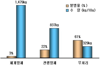 주 : 1) 관행방제: 리도밀동수화제 1,000배액 발병초부터 20~30일 간격 3회 살포.